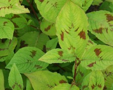 Erbacea Perenne, dal fogliame verde macchiato di bruno al centro, produce copiose infiorescenze di colore rosso.